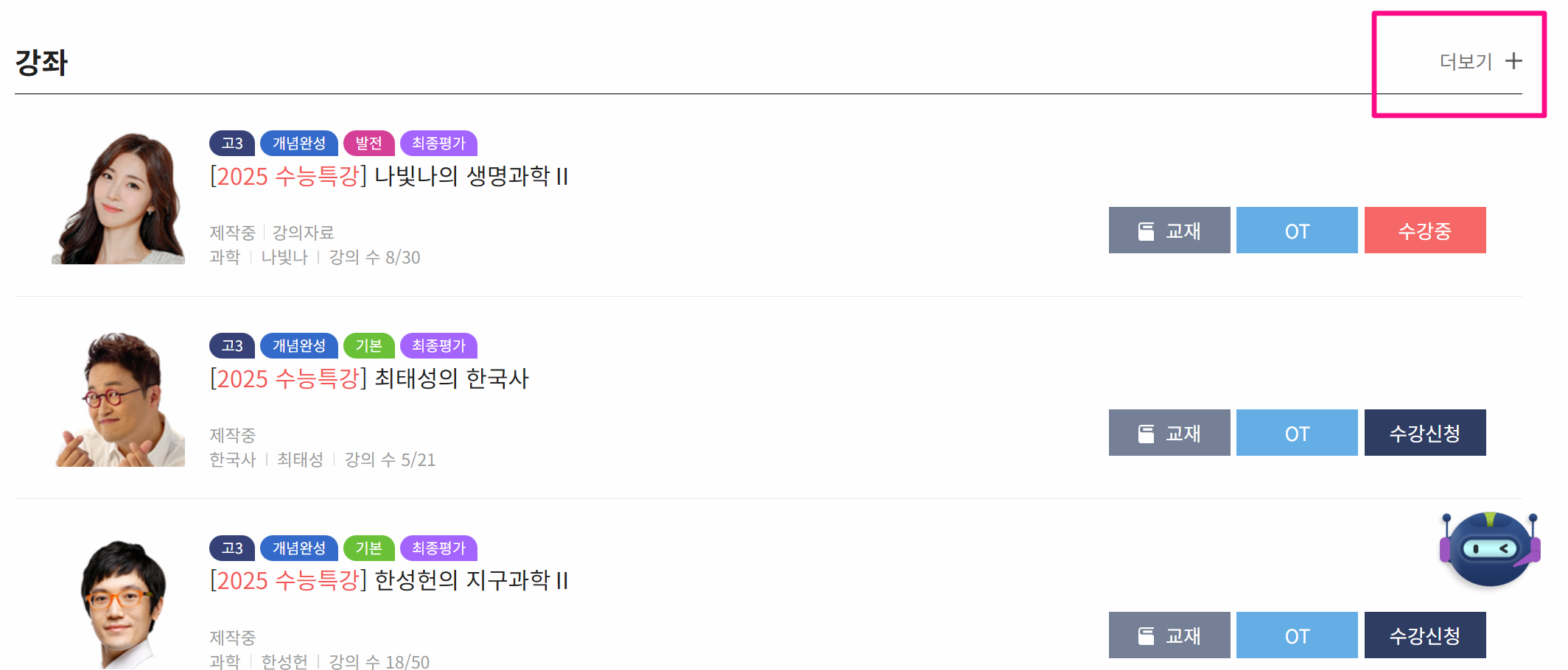 1-3. 본문 아래 강좌에서 "더보기" 클릭 > 자신이 원하는 강좌 수강신청 클릭합니다.