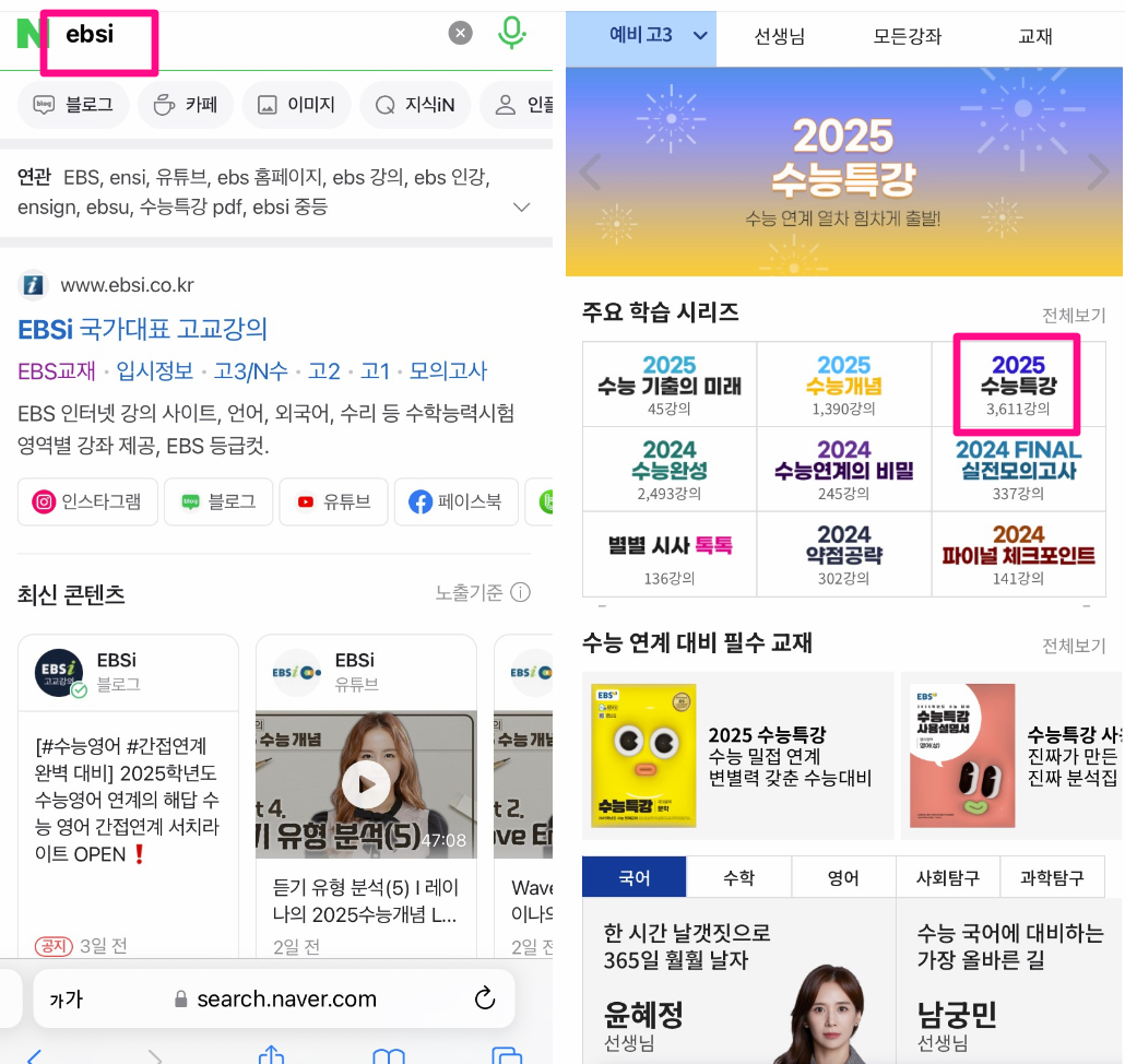 2-1. 모바일 검색창에 EBSi 검색 -> 2025 수능특강 클릭