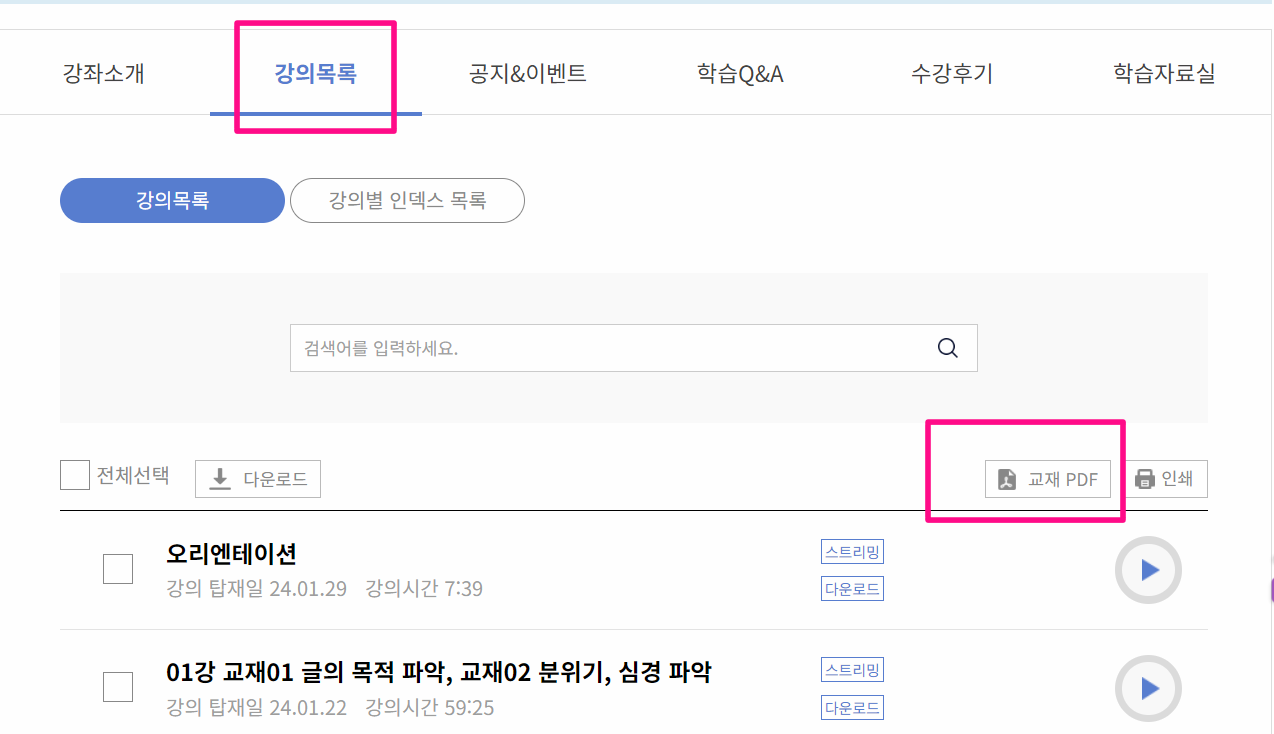 2- 4. 강의목록을 클릭하면 PDF교재를 다운로드 받아 활용하실 수 있습니다.