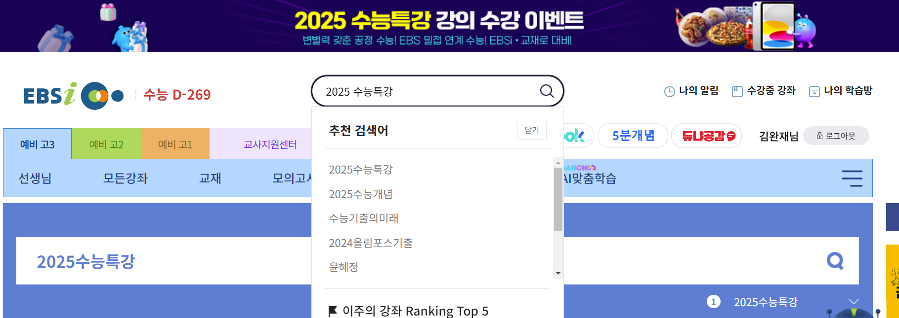1-2. 검색창에 2025 수능특강을 검색해 주세요. 혹은 홈페이지에서 보이는 수능특강 2025 배너를 클릭하셔도 가능합니다.