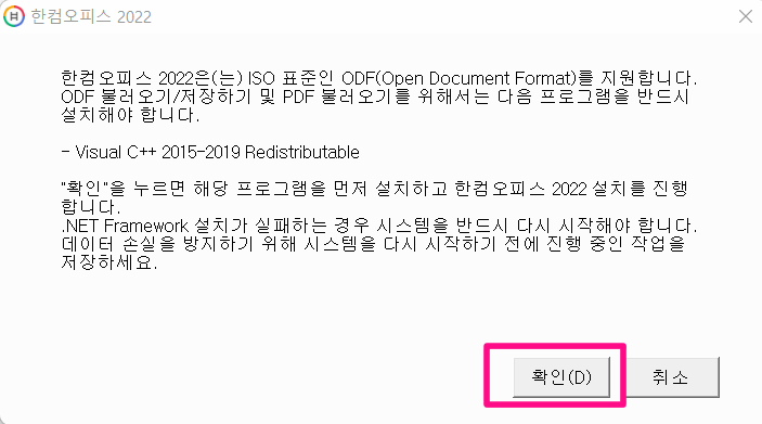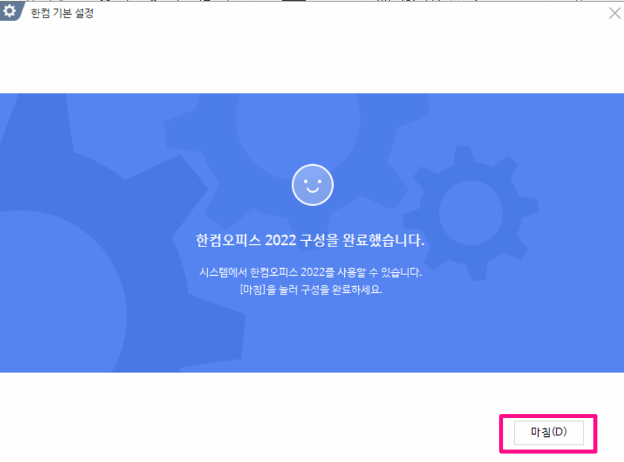 한컴오피스 2022 구성이 완료되었다고 나옵니다.