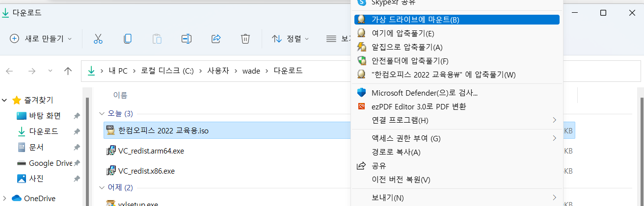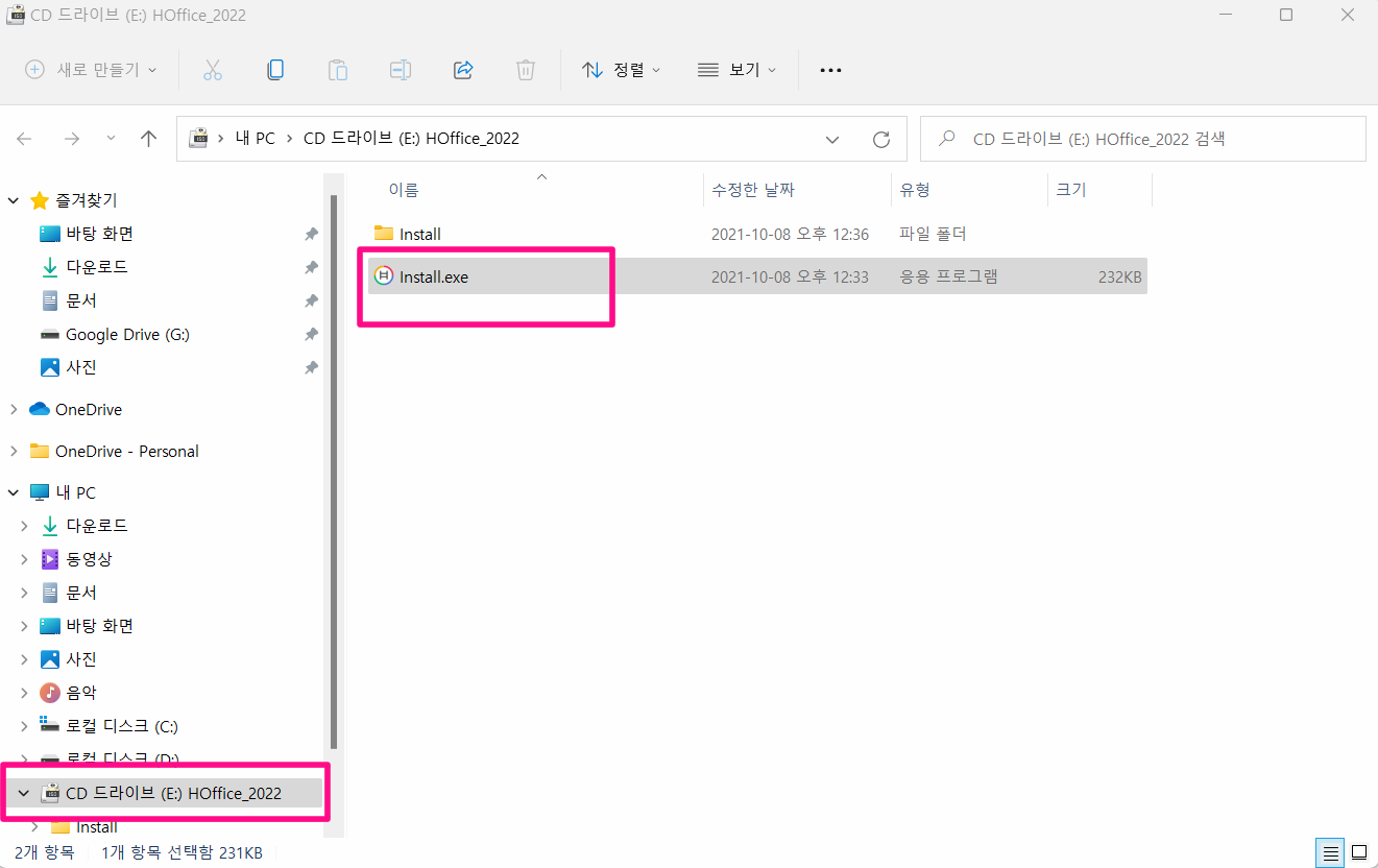 가상 CD 드라이브에 한컴 오피스 2022가 생성되는 걸 확인할 수 있습니다.