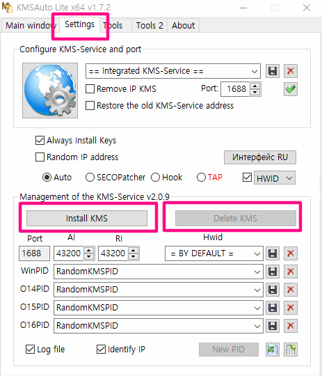 Settings으로 이동하면 KMS 인증서버를 설치하거나 삭제할 수 있습니다.