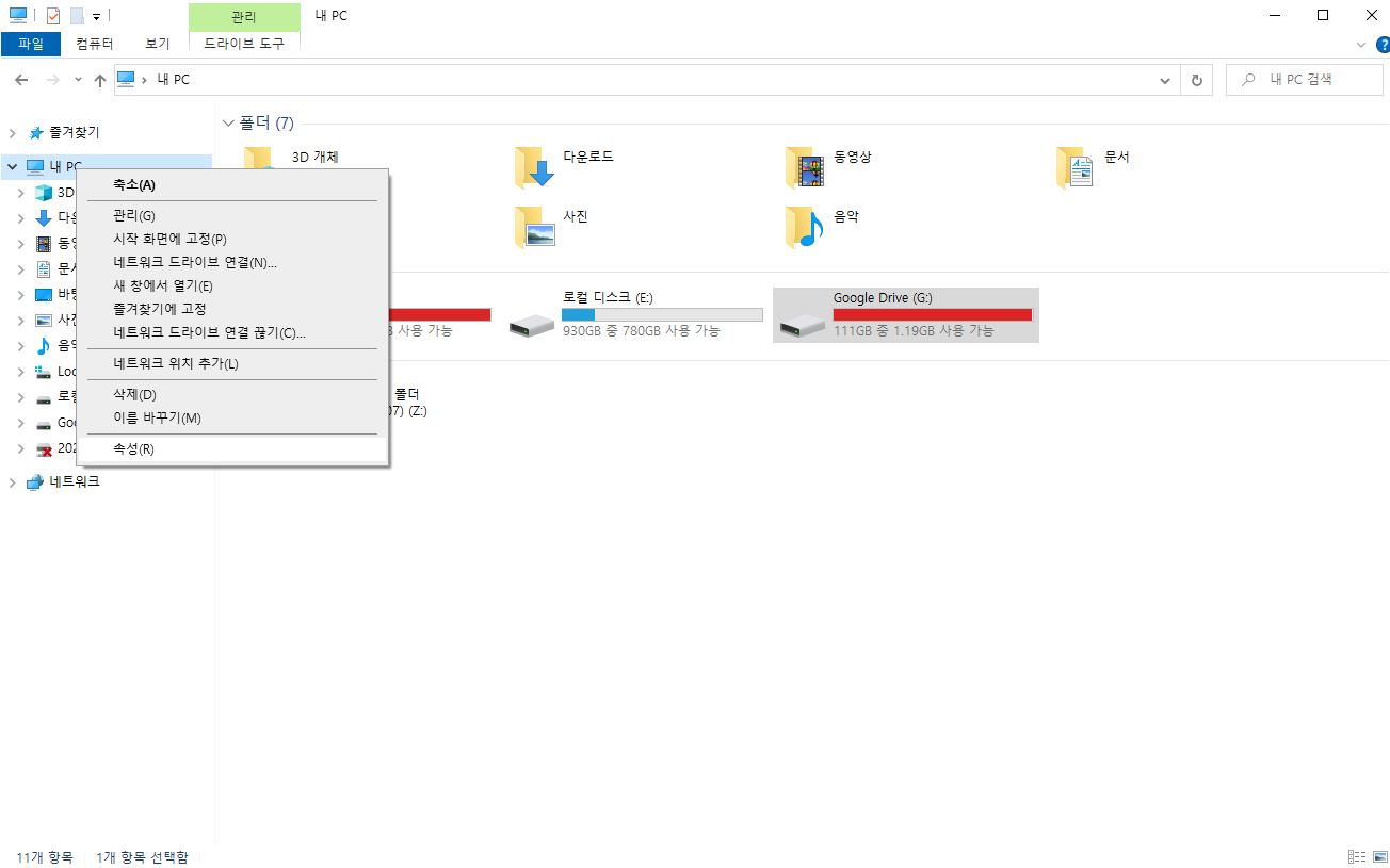 내 PC -> 속성으로 이동합니다.